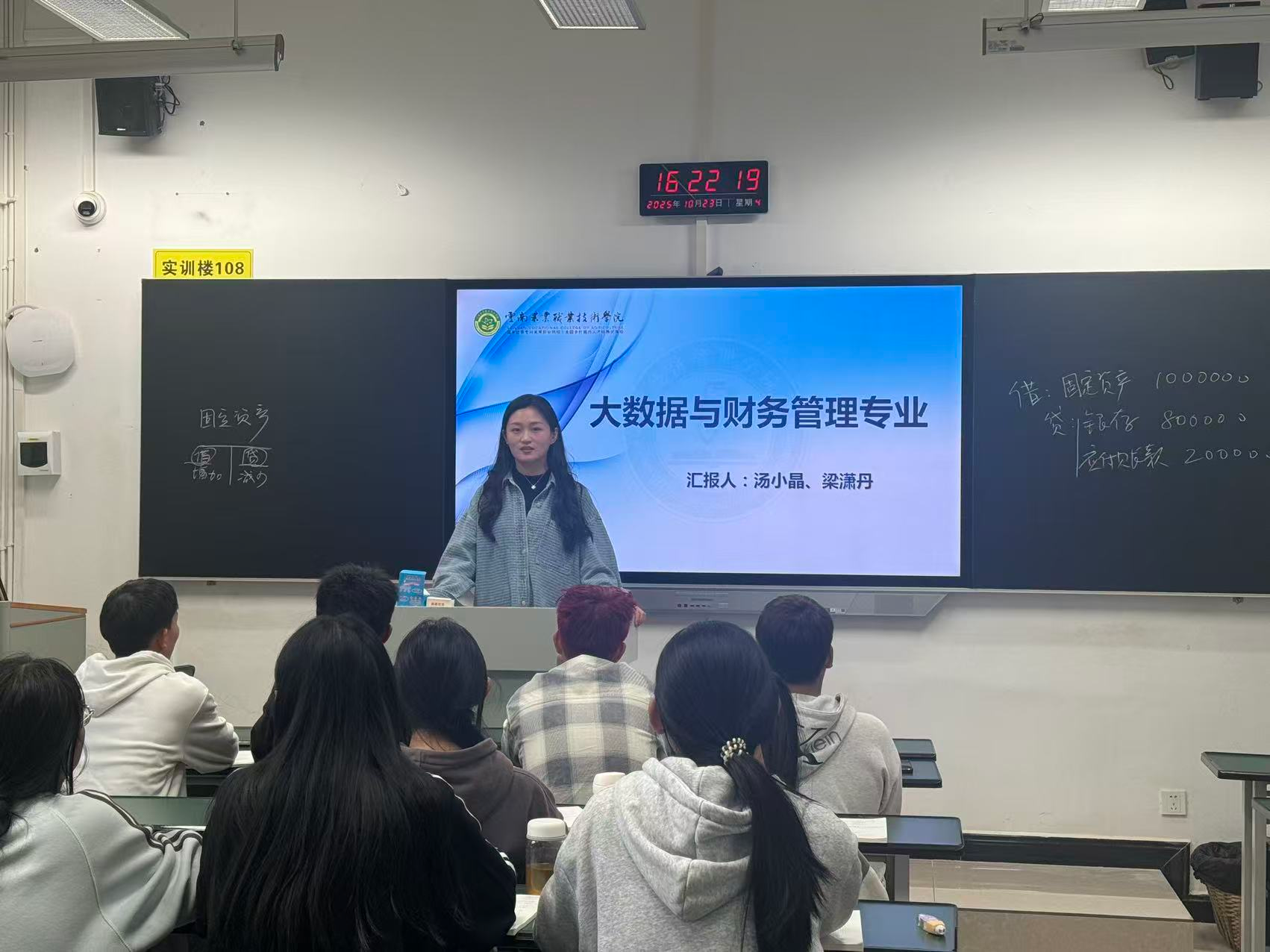 教研活动金秋送爽,丹桂飘香,在这充满希望与憧憬的美好时节,我院迎来了秋季学期开学的重要时刻,师生们都满怀热情与期待,共同开启了新学期的崭新篇章。为了加深同学们对大数据与财务管理专业的认识,明确专业学习目标,帮助他们了解专业的培养过程、未来发展方向以及就业情况,10月23日下午,教研室主任汤小晶老师和骨干教师梁潇丹老师给考入我院2025级大数据与财务管理专业的学生,开展了题为“大数据与财务管理专业专业认知”的专题讲座,新生们上了“专业第一课”,效果显著。