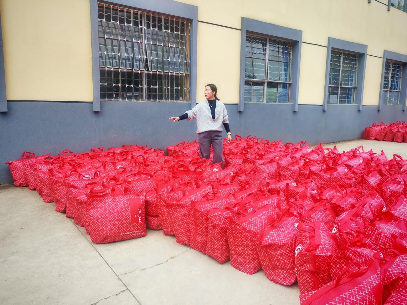 老师清点毛毯物资数量