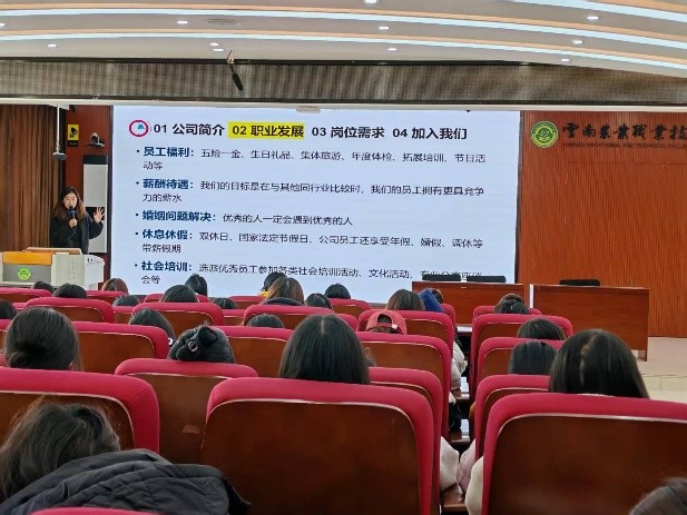 两家公司的招聘宣讲充分体现了行业对高素质应用型人才的迫切需求。云南财当家公司深耕一站式商业服务领域十年,此次推出会计实习生、财税顾问实习生等岗位,聚焦财会专业核心能力,提供从应岗实习到定岗晋升的完整成长路径,高管一带一、定期评估晋升等机制为学子职业发展保驾护航;云南嘉华食品作为本土烘焙行业龙头企业,300余家直营门店与完善的产销体系为门店营业员岗位提供广阔平台,清晰地从营业员到大区经理的晋升通道,让学子能在实践中实现职业进阶。