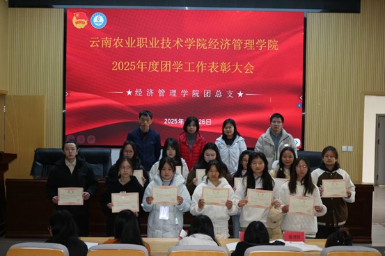 党团建设为全面总结本学期团学工作成效,表彰先进典型,激发组织活力,2025年12月26日中午,云南农业职业技术学院经济管理学院隆重召开了2025年度团学工作总结暨表彰大会。学院院长梁盈老师、副院长刘锦江老师、党总支副书记牛笛老师、团总支书记姚远博老师及辅导员任黎帆老师与全体学生骨干与志愿者代表共计100余人参加会议。