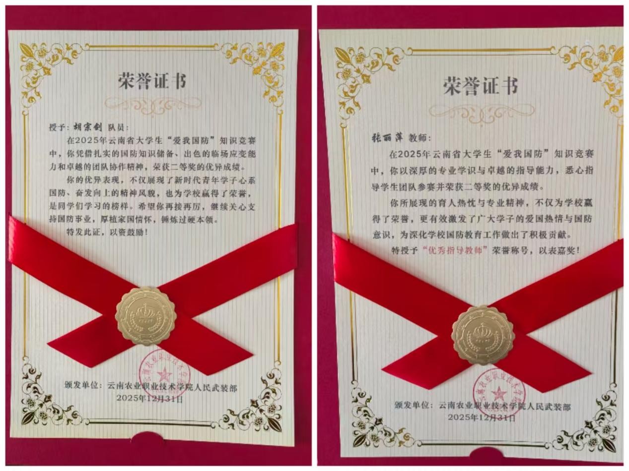 尤为可喜的是,我院2024级行政管理二班胡宗剑同学在11月26日举办的云南省“爱我国防”大学生知识竞赛中沉着应战、发挥出色,荣获省级二等奖,并在本次大会上获得公开表彰。其指导教师张丽萍老师因全程悉心指导,被授予“优秀指导老师”荣誉称号。这一成绩的取得,既体现了学生个人的勤奋努力,也反映了学院注重学生综合素质培养、扎实推进国防教育的成效。