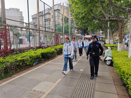 当日下午2时30分,参与活动的同学们在学院集合,统一整队出发,前往昆明体育场周边区域开展巡查工作。此次活动以昆明体育场为重点巡查区域,结合当日体育赛事安排,同学们在茭菱派出所民警的带领下,分为两组、每组10人,依次开展巡查。