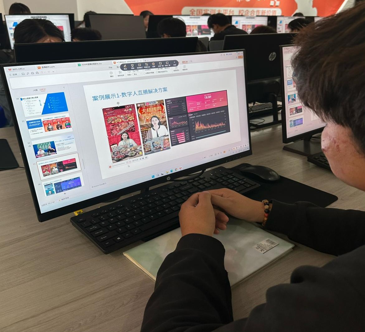在数字人应用层面,杨老师进行了更为深入的行业剖析。他首先客观分析了传统真人直播在成本、时间、稳定性、场景局限性等方面的痛点与不足,进而系统阐述了数字人直播在降本增效、7x24小时不间断工作、场景快速切换、品牌形象统一、规避真人不可控风险等方面的显著优势。为了增强说服力,杨老师现场展示了多个真实落地的数字人直播案例,覆盖了产品讲解、品牌宣传、客服答疑、教育培训等不同商业场景。逼真的形象、流畅的交互、丰富的场景,让同学们对数字人直播的商业价值和应用前景有了具象而深刻的认识。
