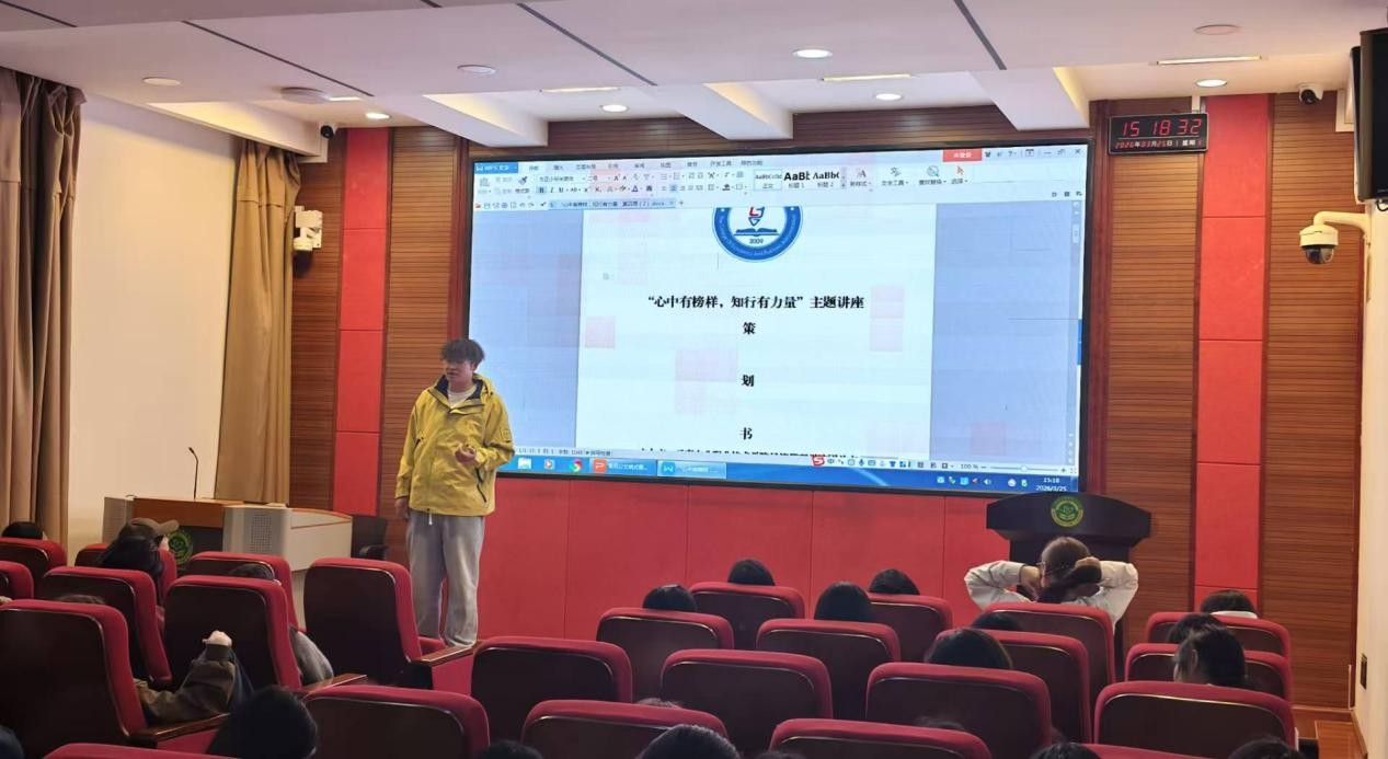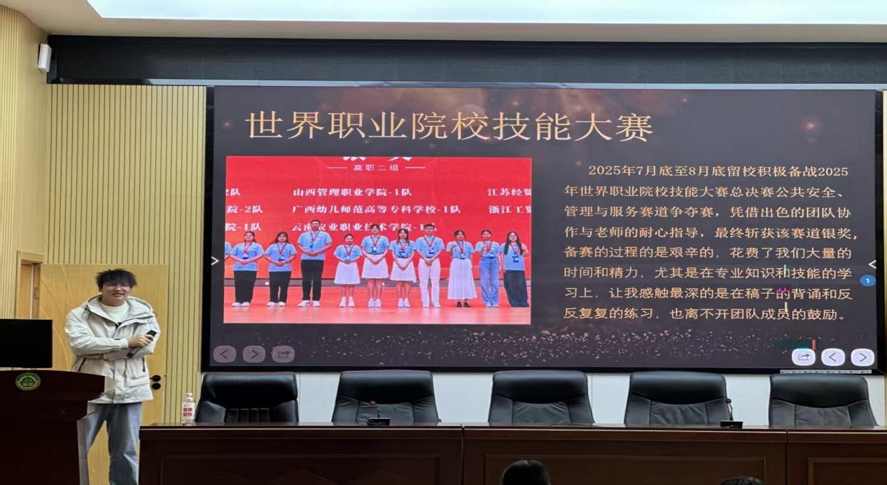 本次活动特邀2024级行政管理二班班长、学院学生会主席胡宗剑同学担任主讲人。胡宗剑同学是2024-2025学年国家奖学金获得者,并在2025年世界职业院校技能大赛公共安全、服务与管理赛道中勇夺银奖,是同学们身边品学兼优、全面发展的先进典型。